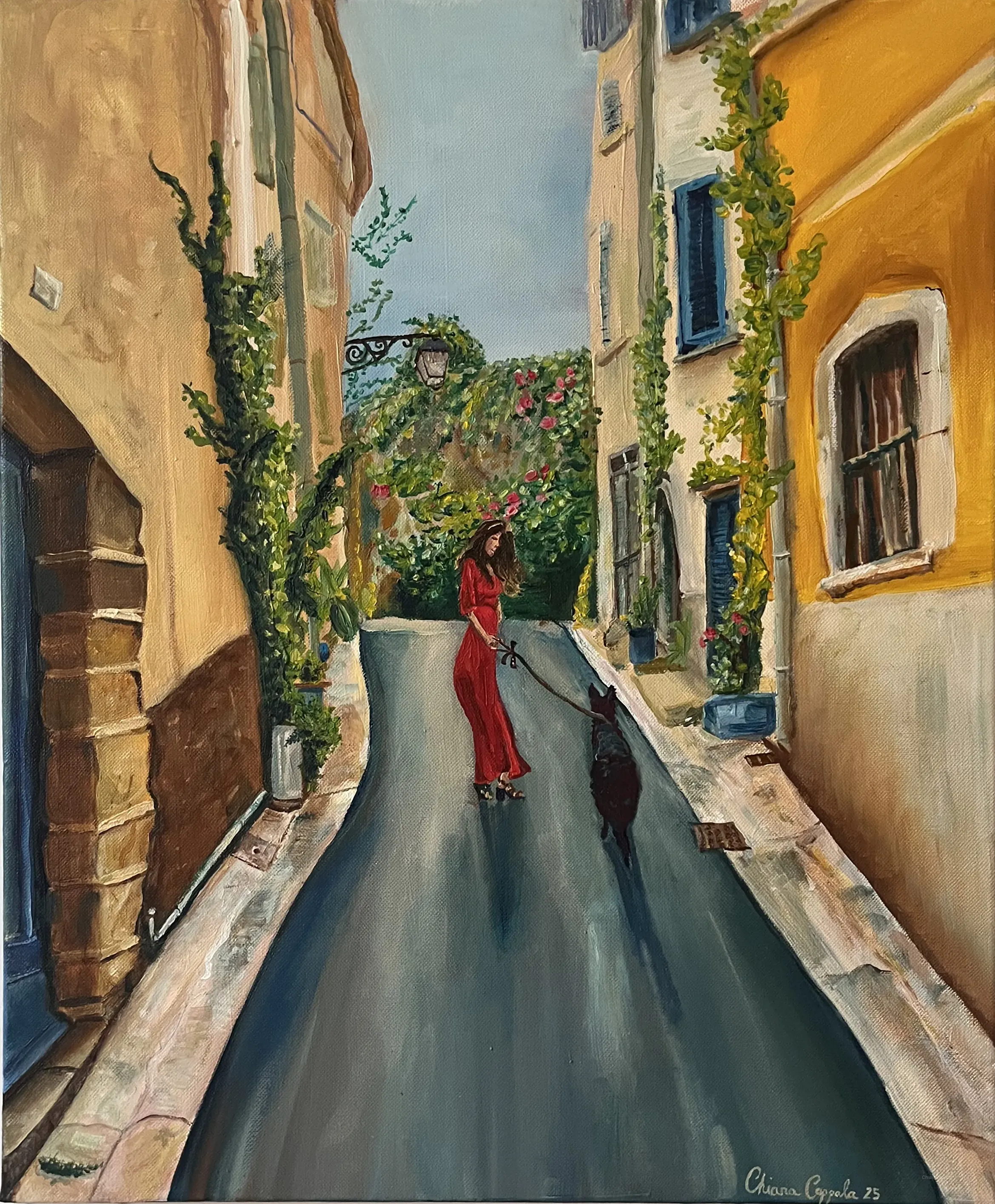 La femme en robe rouge se promène dans une ruelle de Hyer. Son chien noir la suivre.