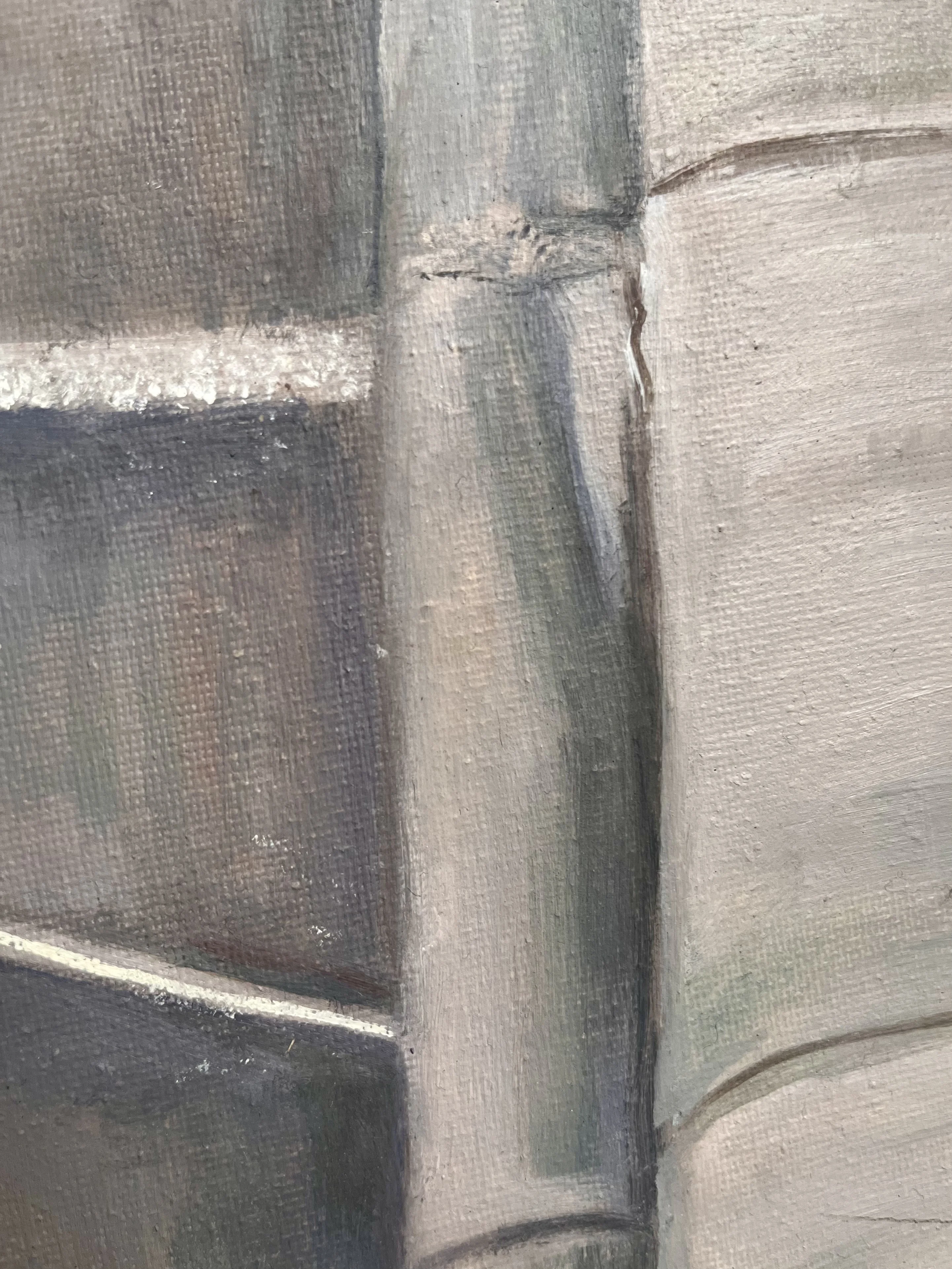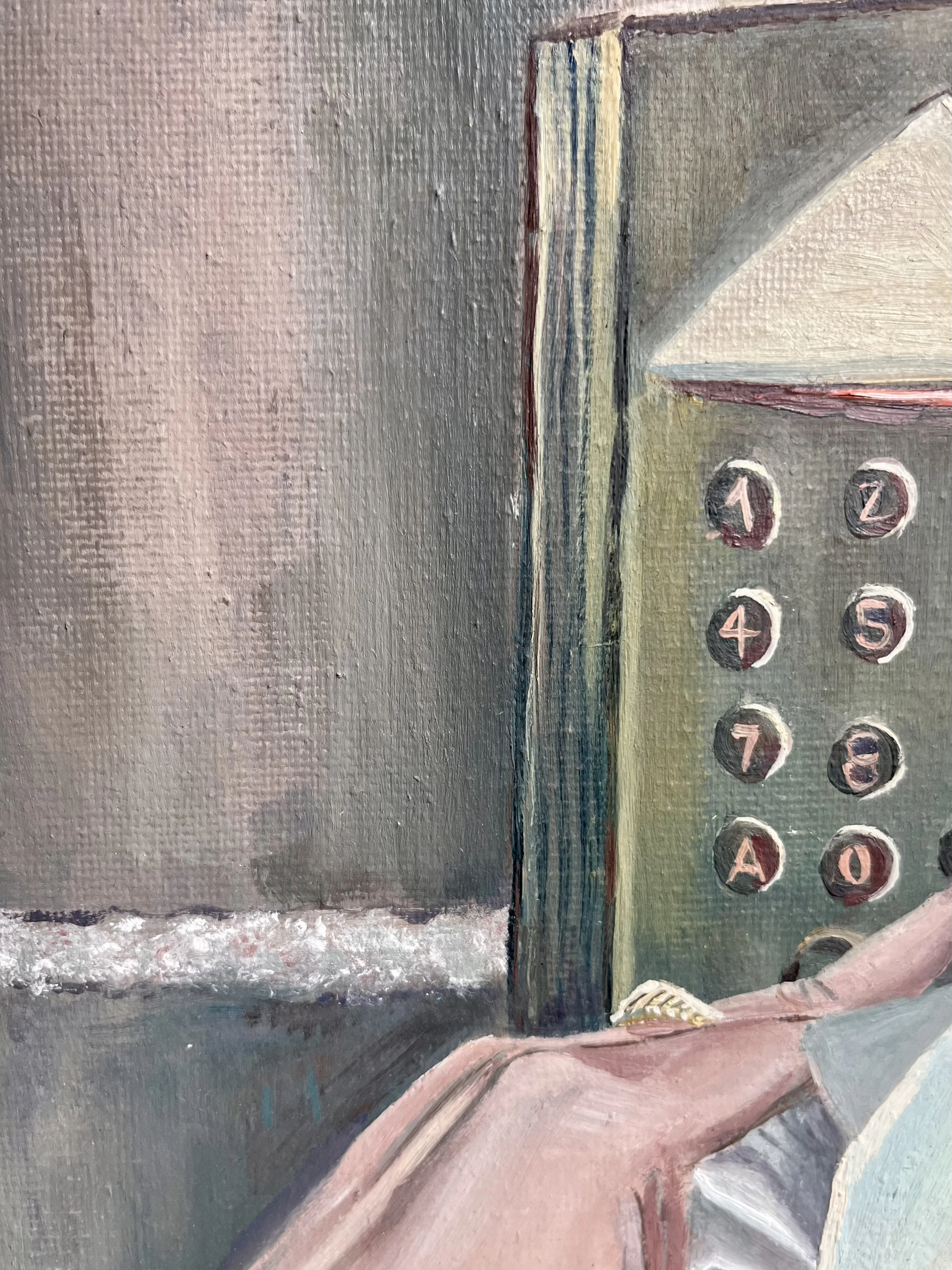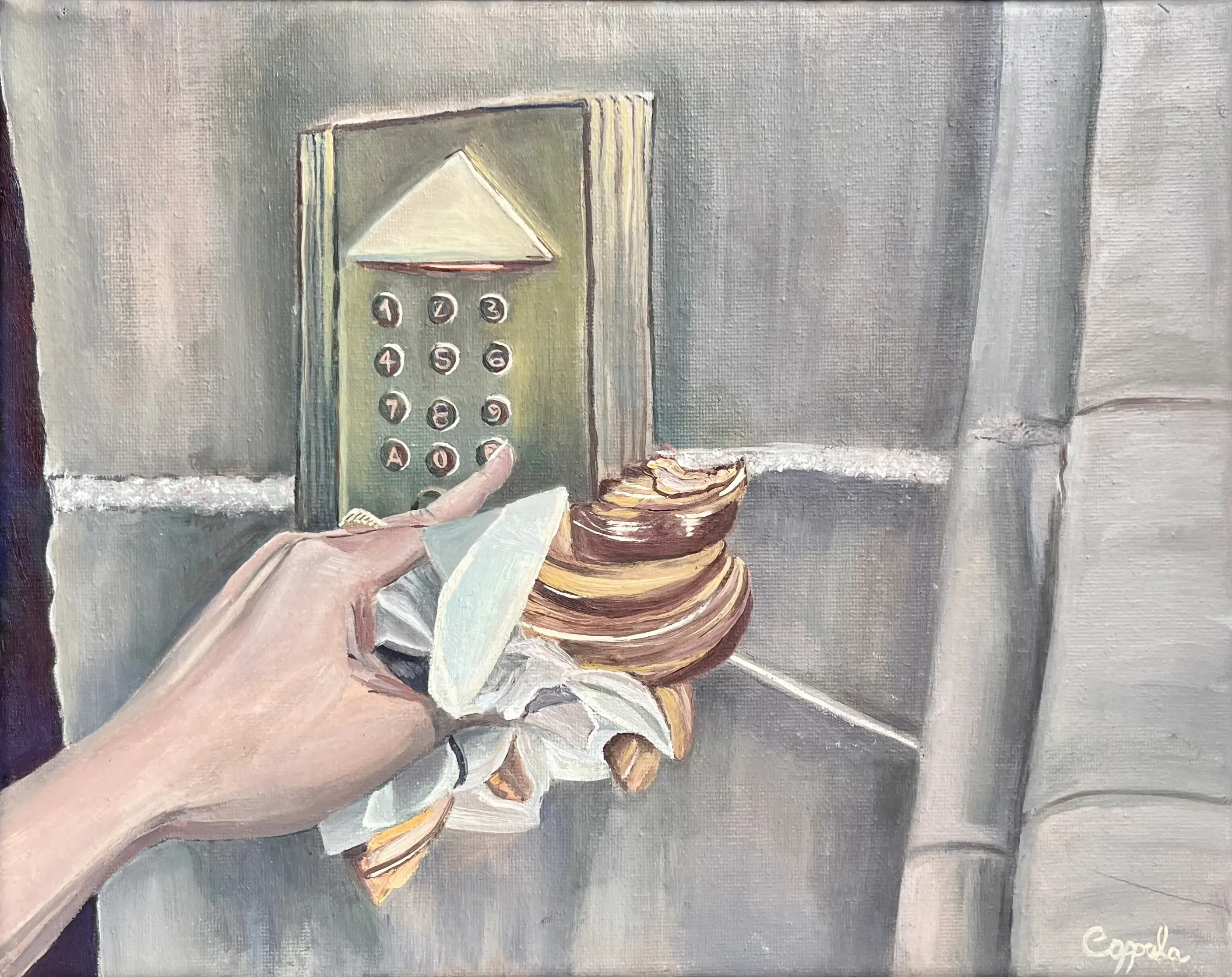 Une main tient un croissant entamé tout en composant le code d’un immeuble parisien. À travers ce geste banal, le tableau évoque une Paris intime et vécue, faite de digicodes et de rituels quotidiens. Loin des cartes postales et de la tour Eiffel, c’est la ville réelle qui se révèle.