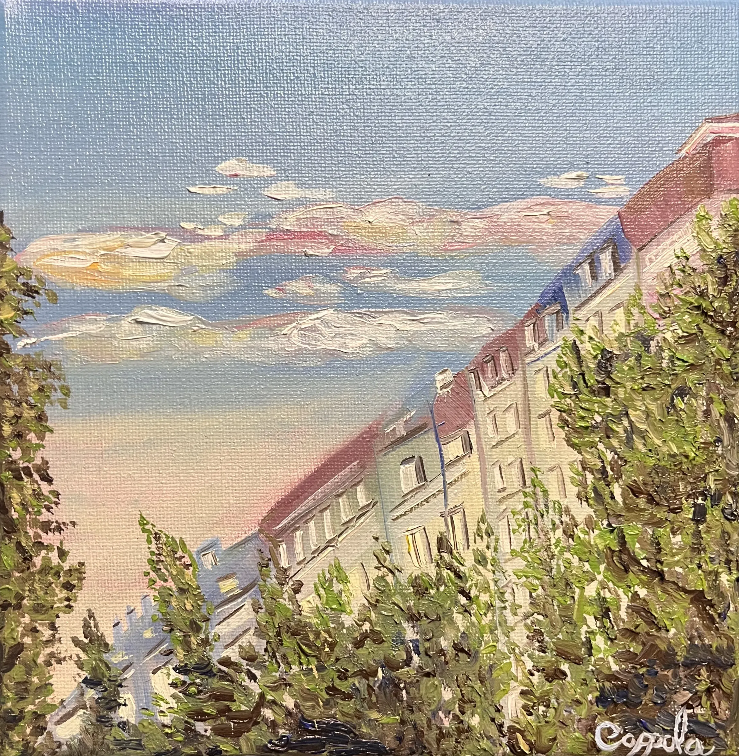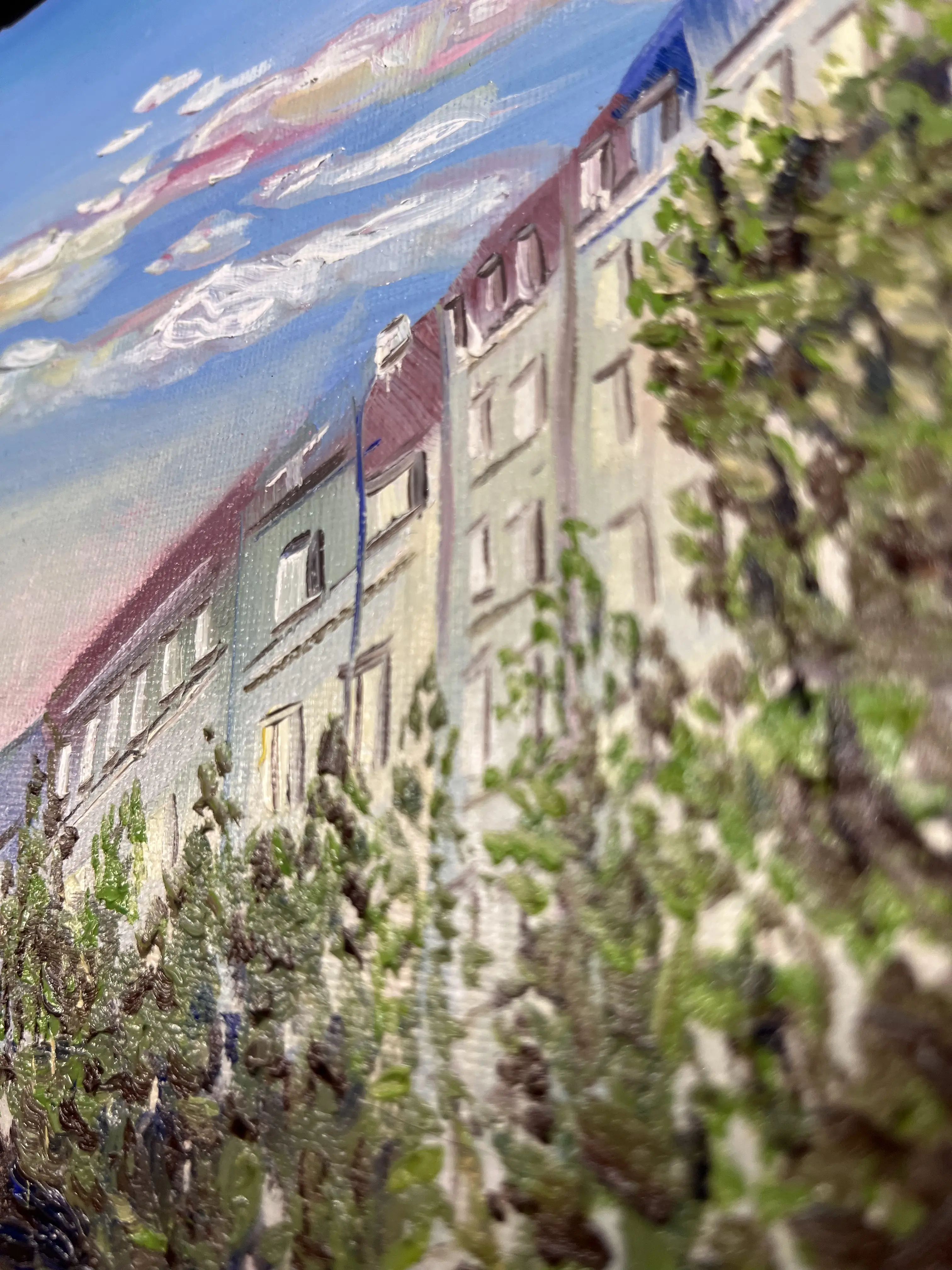 Une respiration suspendue au-dessus du tumulte urbain. Les nuances de zinc et d’ardoise s’entrelacent dans une danse chromatique, où chaque coup de pinceau semble sculpter la lumière déclinante. C'est une œuvre de silence et de nostalgie, une ode vibrante à la beauté discrète de ce qui nous surplombe.
